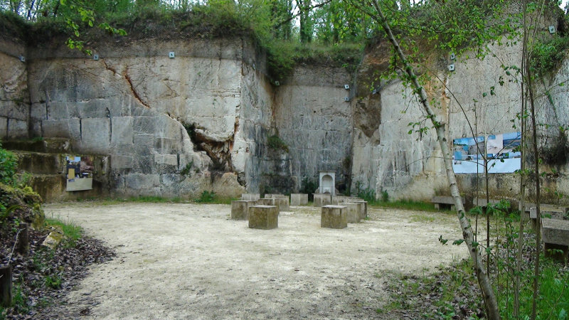 Allez, encore de la route, mais un tout petit peu, cette fois. Nous avons visité la carrière de pierre de Crazannes, située dans une forêt. La pierre est blanche et quand les ouvriers travaillaient au soleil, les pierres pouvaient les rendre aveugles….nous avons aussi appris que pour détacher les blocs de pierres de la roche, les ouvriers plantaient des bâtons entre deux blocs et ensuite, ils mouillaient leurs pics de bois qui gonflaient et faisaient se détacher les blocs.