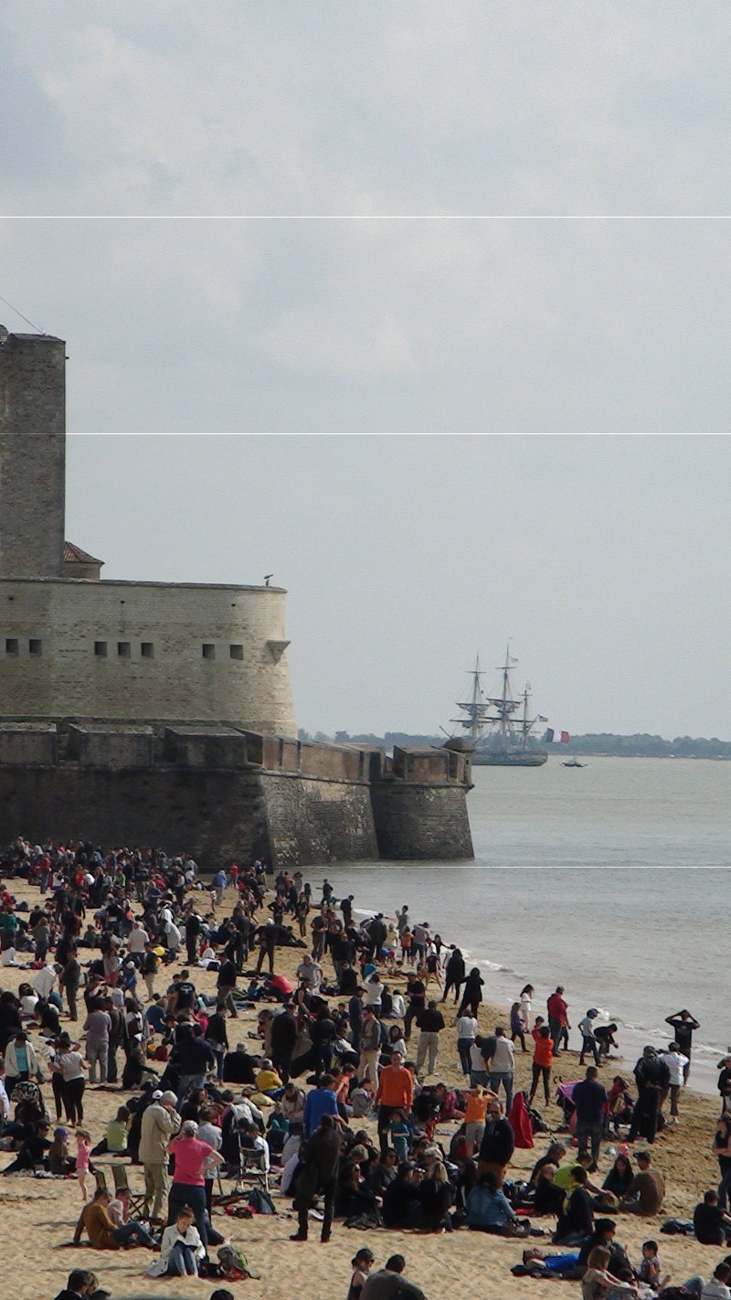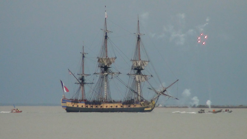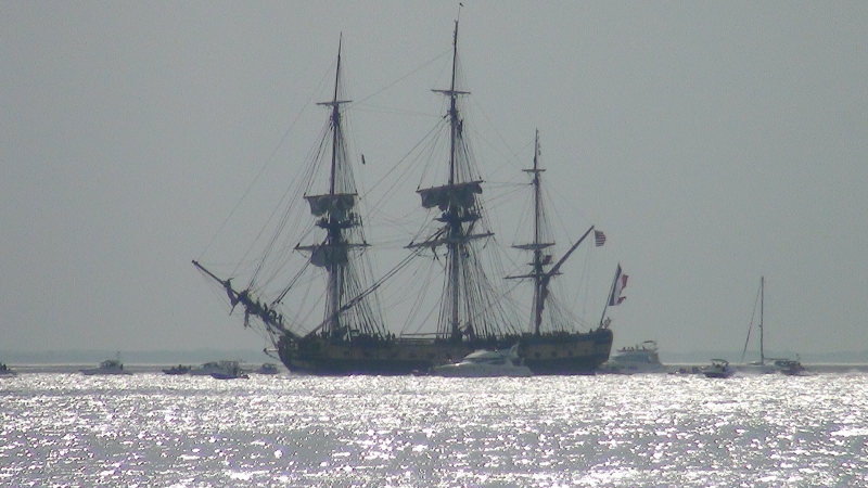 Rien de spécial dans la matinée mais l’après-midi, départ de l’Hermione, magnifique frégate partant pour l’Amérique et retraçant le chemin de Lafayette, il y a 235 ans déjà. Les canons ont tiré plusieurs coups et des dizaines de voiliers suivaient le bateau. Mais quand elle s’est engouffrée dans la Charente, les policiers, dans leurs bateaux, ont barré la route des curieux. Puis le magnifique bateau a disparu derrière le Fort Vauban. Nous avons admiré tout cela depuis la plage où nous nous sommes bien amusés jusqu’à ce que l’Hermione quitte notre horizon.