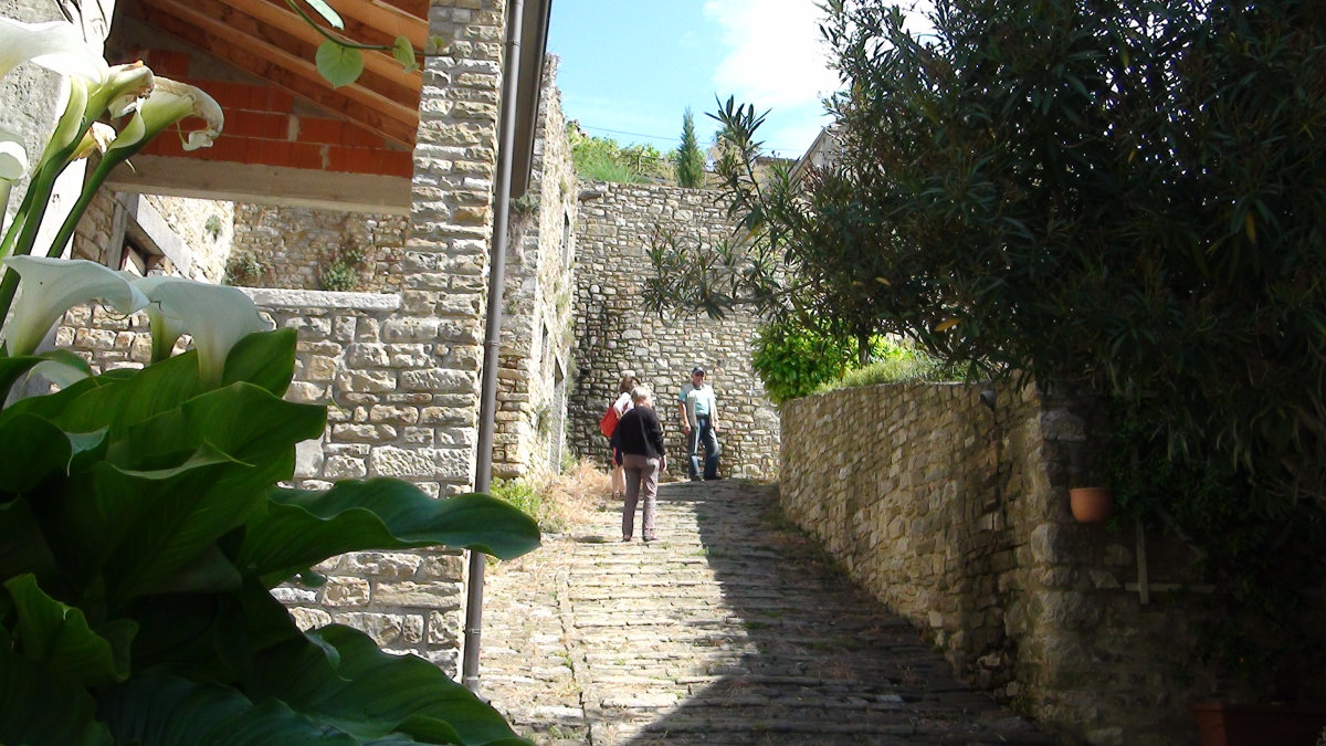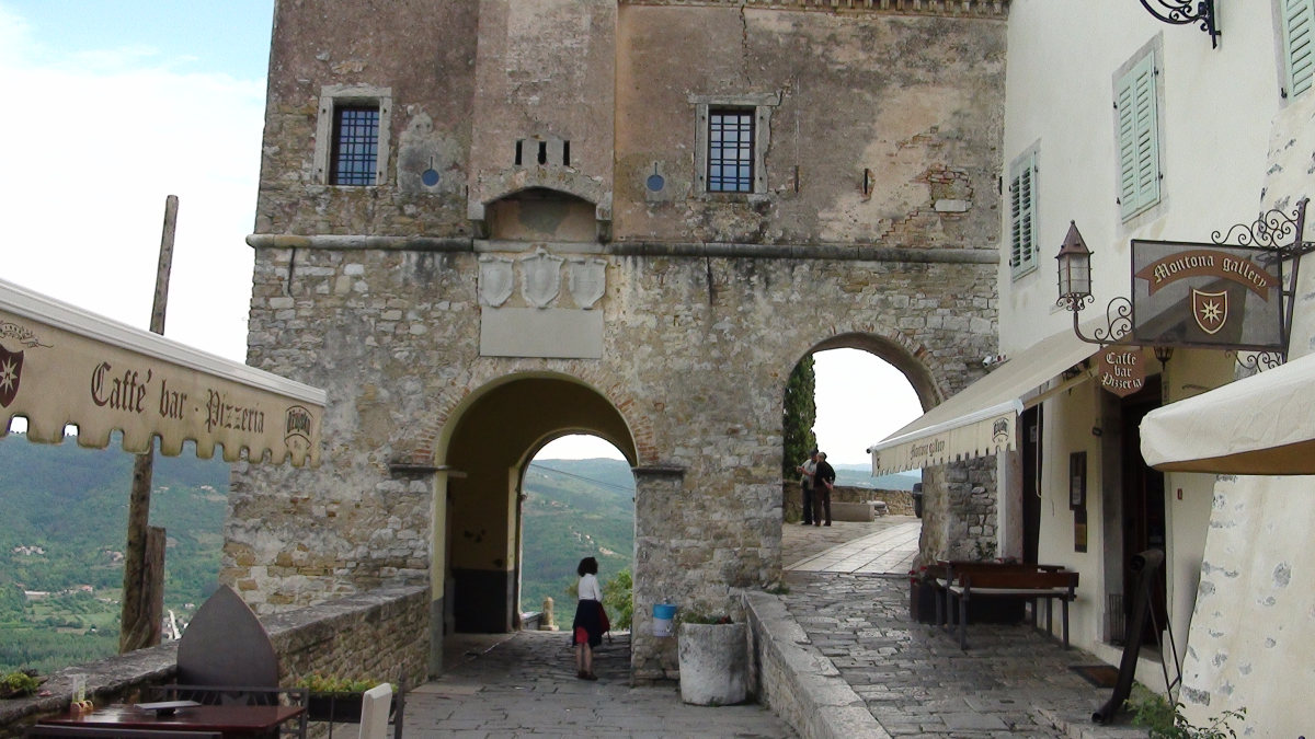 Ce matin le temps correct (20° à 7h30 et un soleil encourageant) nous permet d’envisager des visites. Après une rapide concertation sur l’itinéraire, nous voici partis pour Motovun, joli village perché à l’intérieur de l’Istrie. Parking spécial camping-car à 100 Kuna les 4h (13€), mais une brillante négociation en anglais nous ramène à 30 Kn les 2h ! Accès au village par un chemin raide, tortueux et empierré de galets pour arriver jusqu’aux remparts. Belle empreinte de la Sérénissime République de Venise qui a occupé la région pendant des siècles, plusieurs lions ailés en témoignent.