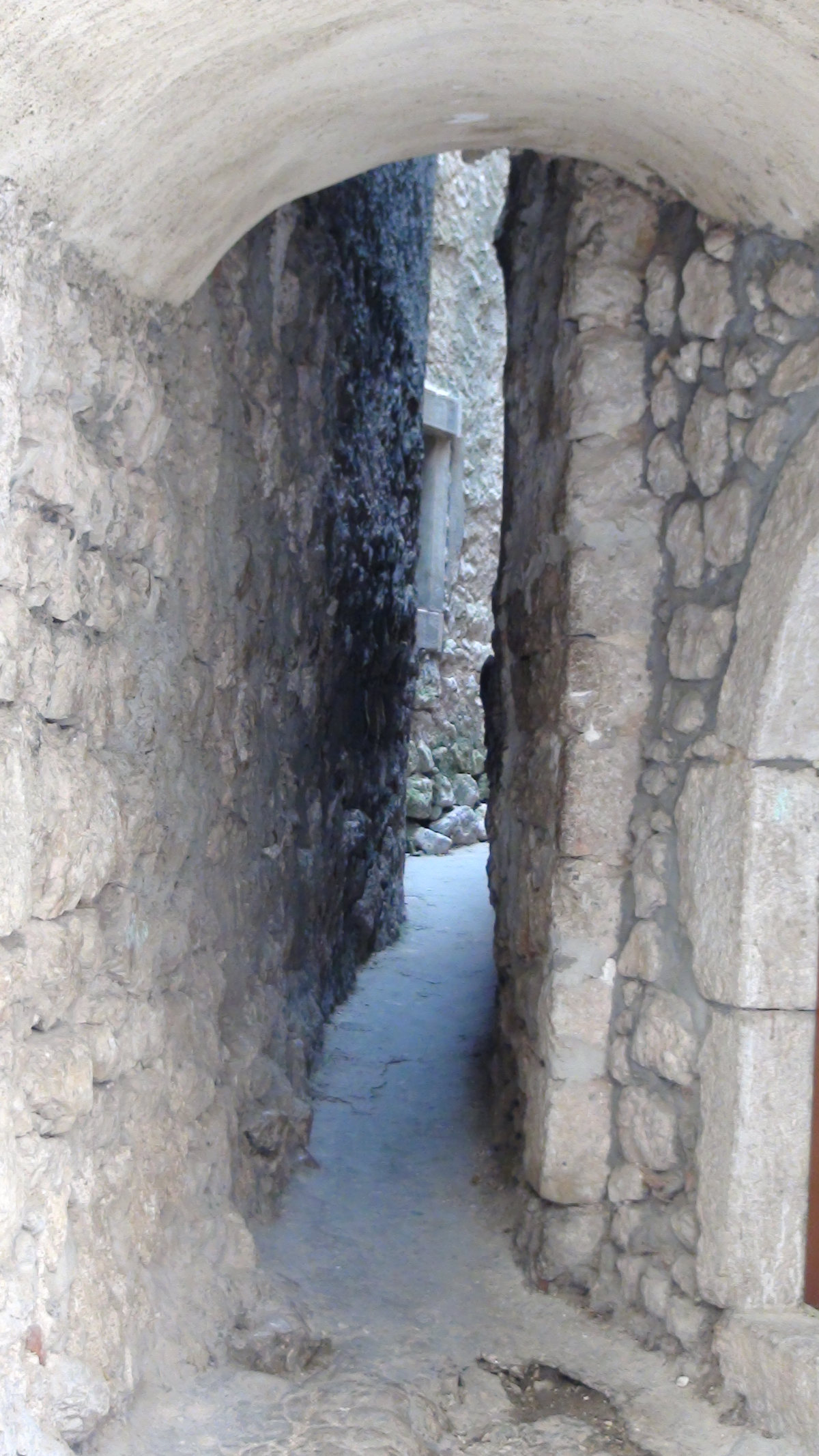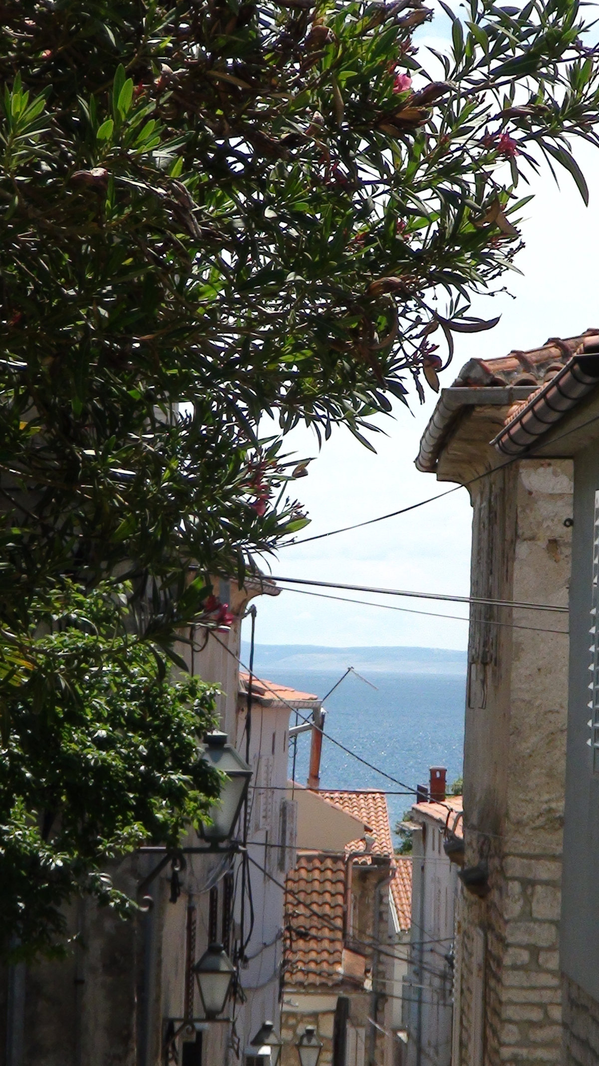 Nous rebroussons chemin pour aller voir Vrbnik. Assez spécial, un village délicat côté stationnement, pas de port devant l’église, et pour cause, elle est perchée sur des falaises comme la majeure partie du village. Du coup, l’identité est préservée, les boutiques rares, l’authenticité fait oublier l’état parfois moyen des façades ; les ruelles battent les records de largeur (43 cm sur la photo, eh ! on passssssse !), des jardins potagers lilliputiens s’étagent sous les maisons tout aussi fleuries, on ne sait jamais bien où l’on est ni où l’on va, on chemine, c’est bien.