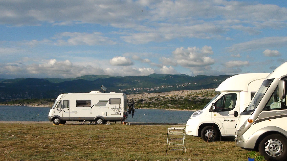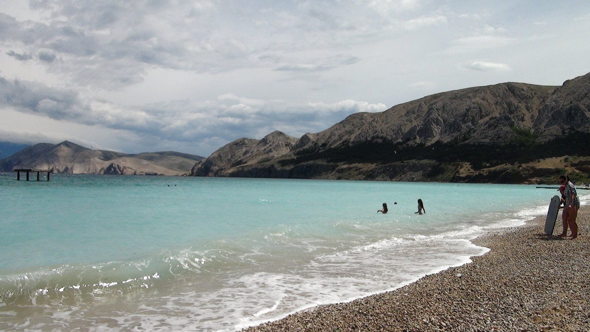 Nous quittons Krk après déjeuner pour descendre vers Baška. Après une quinzaine de kilomètres perchés à 250m au milieu des champs de cailloux, nous abordons la descente sur une vallée incroyable, très différente de Krk, pour découvrir une station balnéaire, toujours charmante, avec de belles lumières, de jolies plages, et l’île de Prvič en face, toute nue, mais nous n’y trouvons pas guère d’autre intérêt que le phénoménal plaisir d’y descendre … C’est tout de même tout près de là (Jurandvor) qu’on a retrouvé une tablette en glagolitique, le premier alphabet en lettre croates.