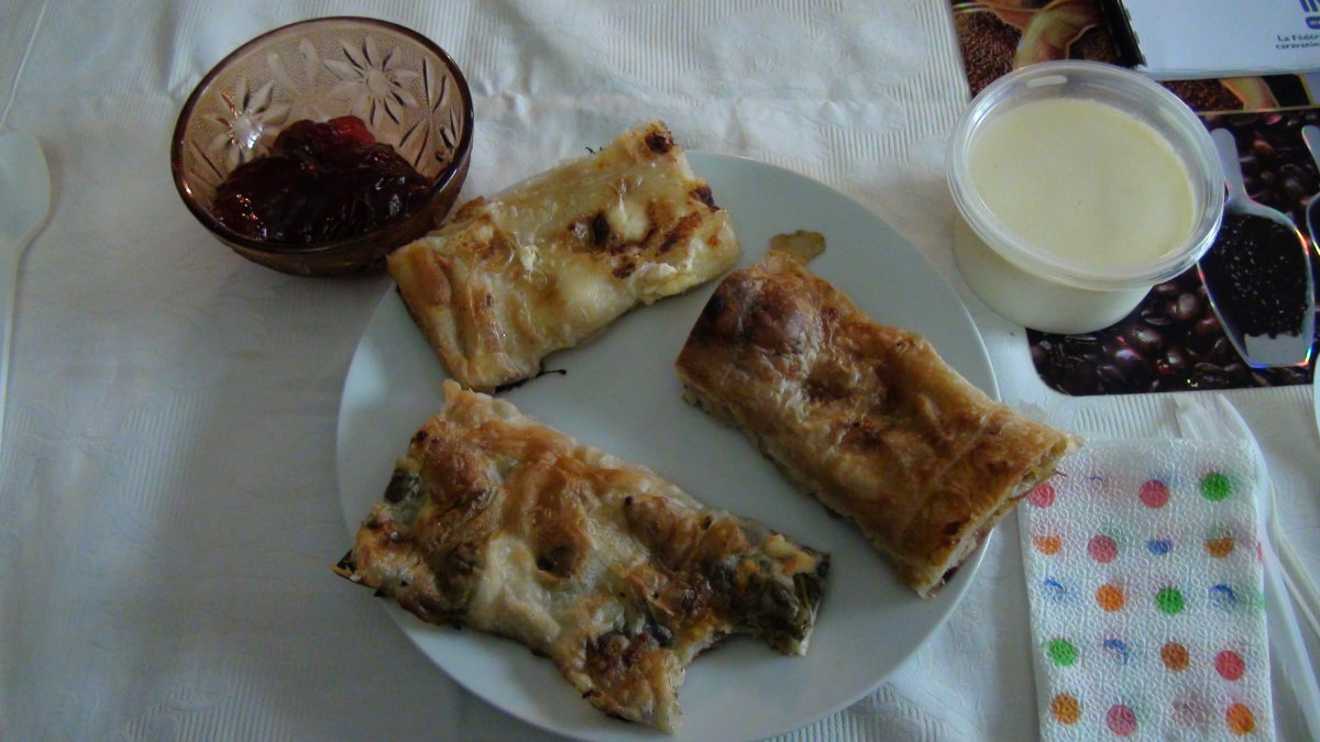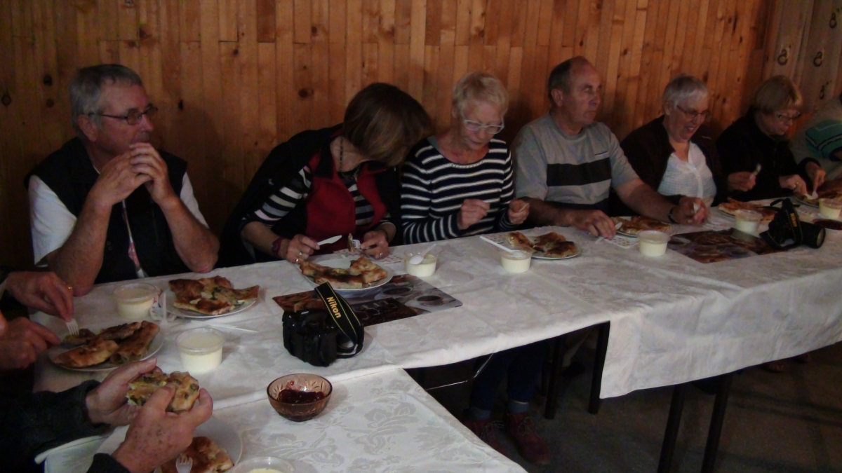 Nous repartons pour accéder à Popovi Livadi, petit hameau à 1400 m d’altitude où nous allons passer la nuit. Après une journée franchement chaude (26°), le temps s’est dégradé à nouveau et l’orage menace. Nous devons nous réfugier dans le chalet pour assister à la prestation d’un couple de musiciens qui, en plus de leur musique traditionnelle, nous présentent et expliquent leurs instruments et costumes. Pendant ce temps, nous dégustons des spécialités locales liquides (vins de Melnik rustiques, peu habituels pour les palais français) et solides (banitsa, et le fameux yaourt bulgare) Nous concluons par un point sur la journée de demain.