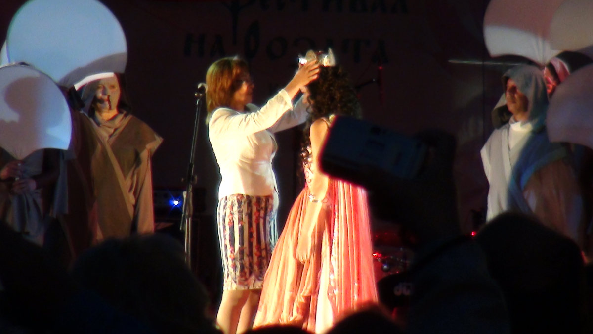 Mais c’est la reine du festival qui nous est présentée à l’issue d’un spectacle … peu convaincant ! Nous rentrons à 21h30 après un feu d’artifice débridé tiré … du sommet du Grand Hôtel qui jouxte la place du festival. Il faut dire qu’alors, un concert de rock bulgare vient de commencer, pas notre truc !