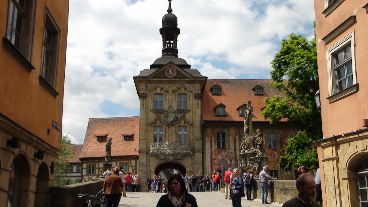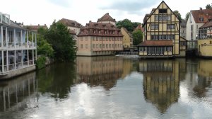 Voilà un effort bien récompensé ! Cette jolie ville, qui a échappé aux blessures de l’histoire, mérite qu’on mette un pied devant l’autre quelques dizaines de fois : une cascade de ponts permettent de passer d’un côté à l’autre de la Regnitz et du canal du Rhin au Danube. Partout les maisons anciennes décorent les rues et puisque « berg » il y a, on finit par monter (un tout petit peu) jusqu’au Dom (cathédrale).