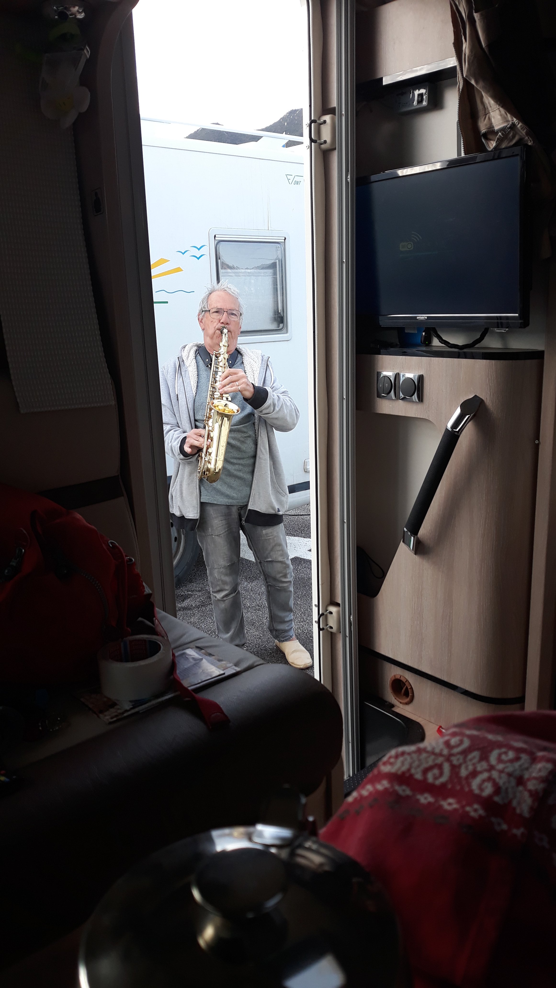Je m’aperçois en ajoutant les photos que j’ai oublié de dire qu’hier soir nous avons eu une toute petite averse avec un arc en ciel somptueux, suivi d’un coucher de soleil pas mal et que ce matin ce fut réveil au saxo avec pains au chocolat offerts par le chef, oui, encore.