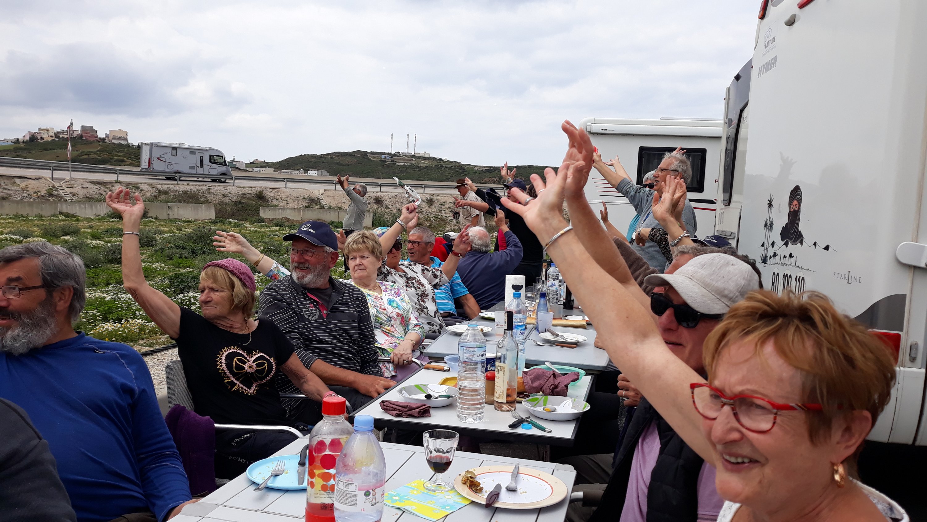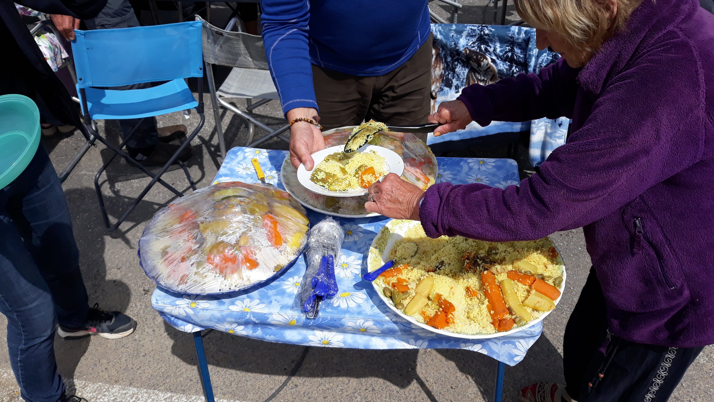 Nous qui restons avons regardé ça avec une certaine tristesse devant cette frénésie. Puis le sourire est revenu parce que le Caïd (maire) nous a offert un couscous, juste à notre groupe, pour nous remercier de notre coopération et de notre bonne humeur. Alors nous avons encore une fois partagé le couscous en saluant les petits paquets de cc qui quittaient le camp encadrés par la police.