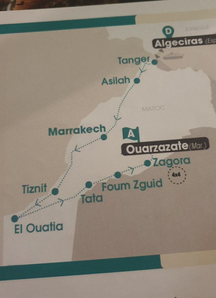 5 janvier, le voyage franchit un seuil et nous changeons doublement de cap. D’abord nous quittons la bordure océanique qui berce nos nuits depuis le 27 décembre (sauf la nuit à Marrakech) et nous cessons de descendre, donc nous remontons un peu.. tiens voici une photo de notre itinéraire ce sera plus clair