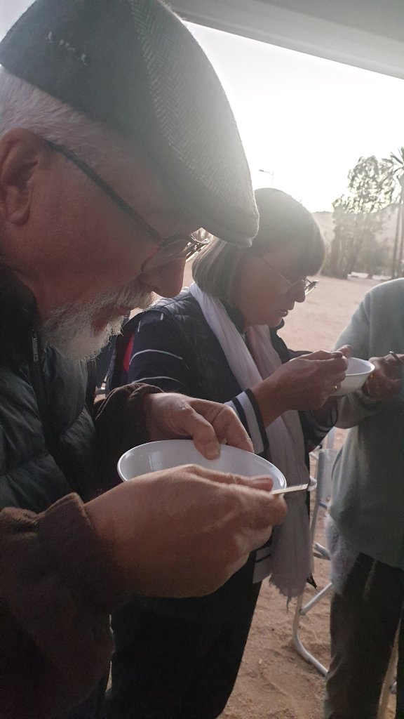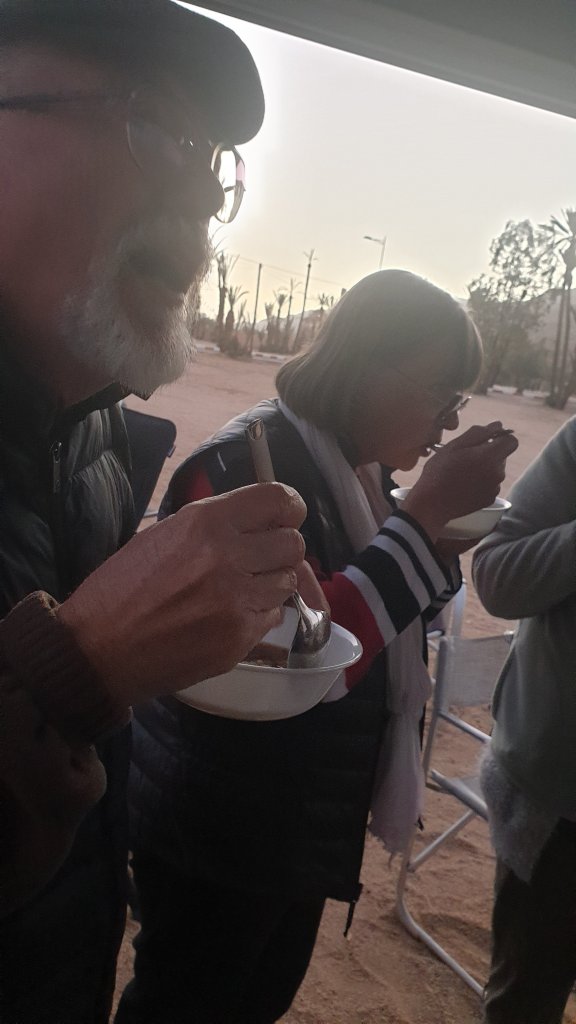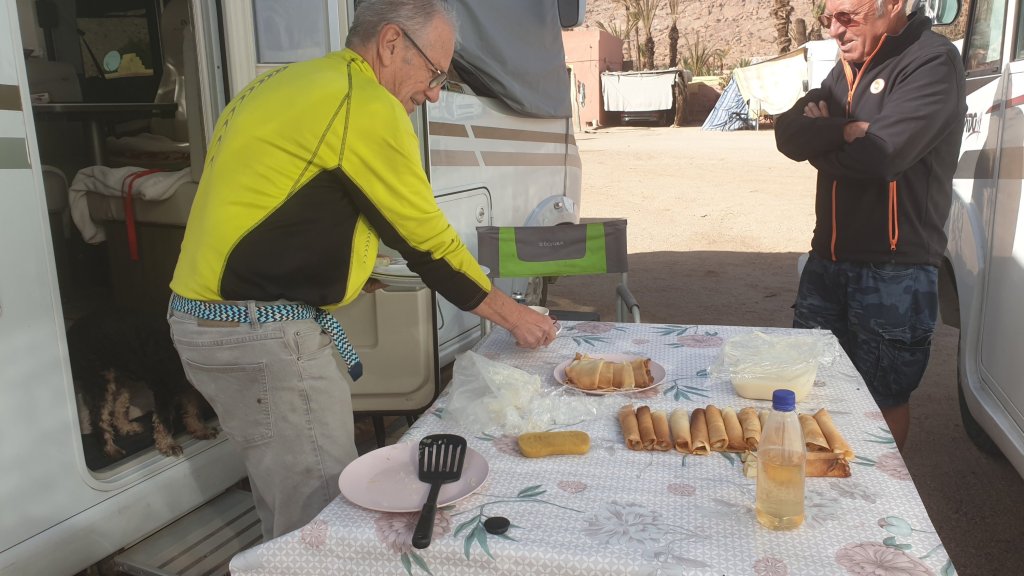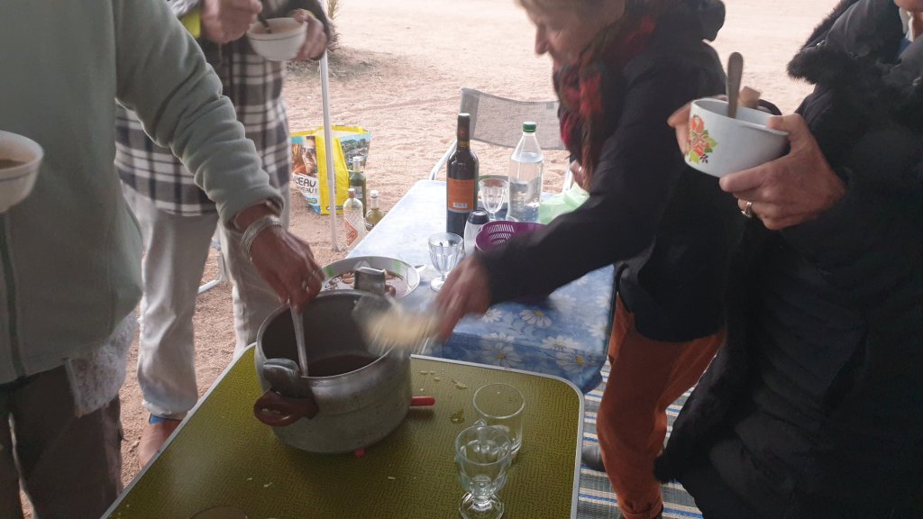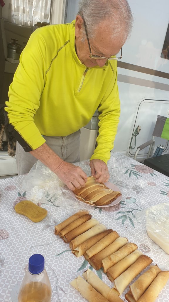 Mais n’allons pas trop vite comme disait Mr X, je n’ai rien dit d’hier. Enfin si j’avais dit journée de repos, elle le fut. Le matin petite balade en ville, réapprovisionnements légers ( non, pas de beignets😭). Après midi sieste, puis rugby (TV). Mais ce fou de Gérard s’est mis en tête de nous offrir des crêpes pour dîner ; dès 9h il était en cuisine. Et Nicole pour ne pas se différencier de son homme a décidé de faire une soupe à l’oignon (et fromage), et donc après un petit apéro, la soupe, puis les crêpes fourrées à la crème, ah on n’a pas des vies faciles…