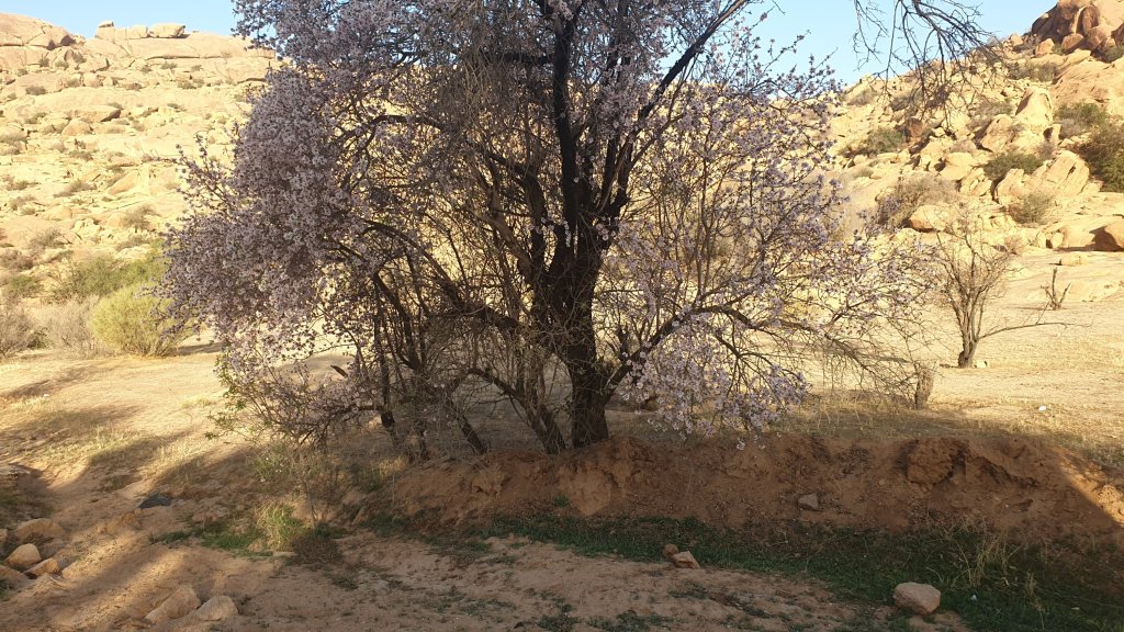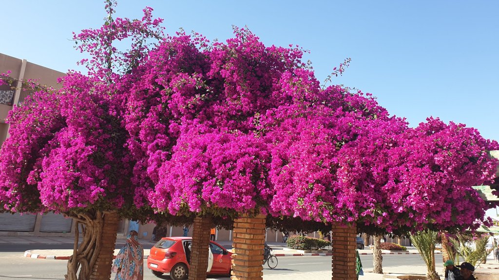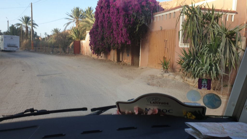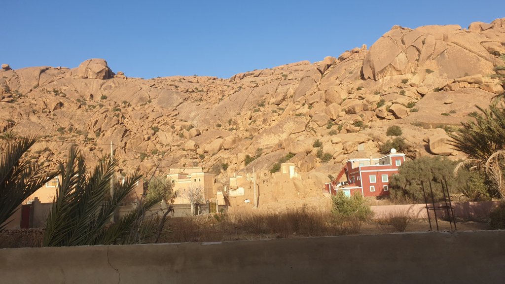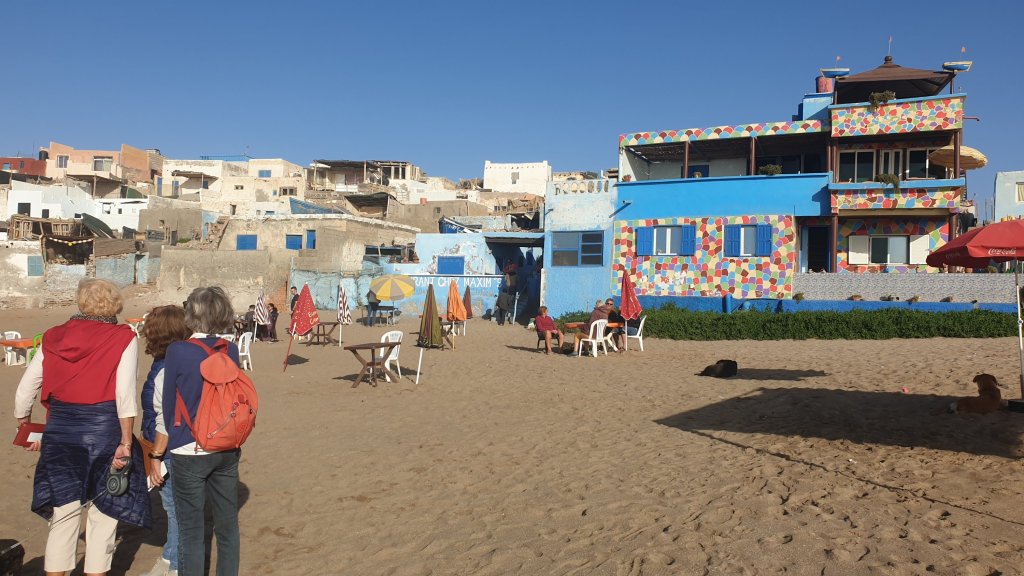 Et ce matin, nous quittons Tafraoute pour rallier Tifnit où nous sommes ce soir. Après quelques kilomètres difficiles dans des paysages très minéraux, l’itinéraire passe par un village dont j’ai perdu le nom à plus de 1250m. À partir de là, la route dégringole jusqu’à Tiznit, puis jusqu’à Tifnit et la mer, du haut, jusqu’en bas, sans faiblir. Nous faisons un arrêt à Tiznit, notre premier lieu de confinement en 2020, ey son magnifique bougainvillier, Tiznit que nous connaissons bien et pour laquelle nous avons un petit attachement : change, réparation d’un téléphone, achat de douceurs, puis nous déjeunons au camping car, avant de repartir vers la mer où nous arrivons vers 16h. Comment dire Tifnit ??? C’est un petit village de pêcheurs au bord de cette côte si dure, il y a du blanc et du bleu, et plein d’autres couleurs aussi, mais moins ; il y a des chiens errants câlins, des marchands racoleurs comme partout, des vagues pour les surfeurs, et un escalier … gonflé, enfin, c’est beau … Des photos ? Bon d’accord, à demain alors…