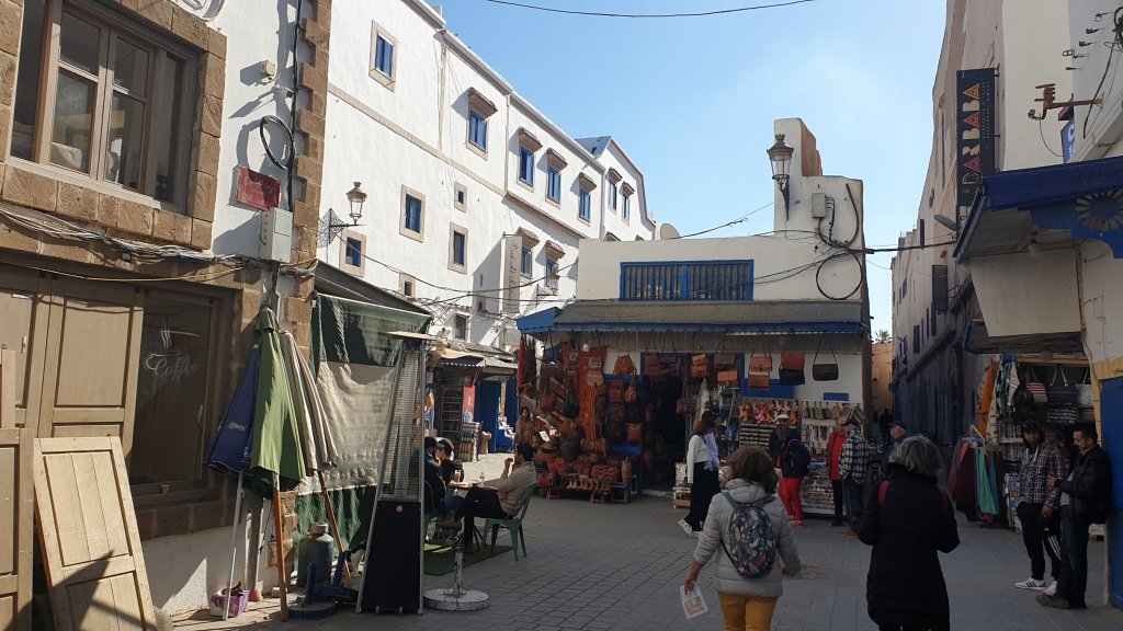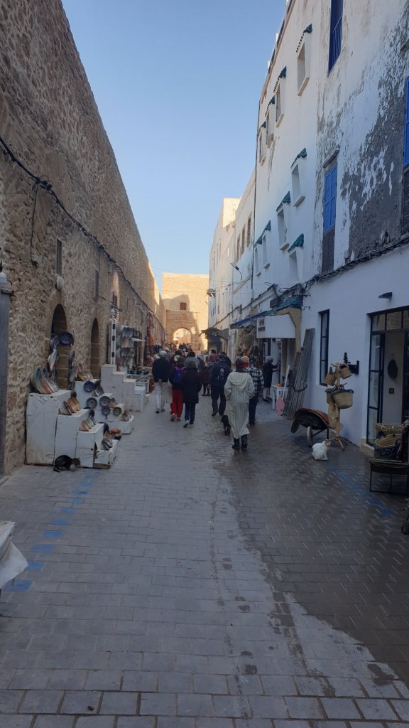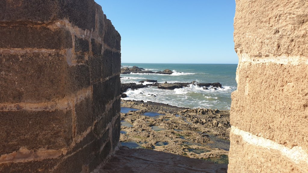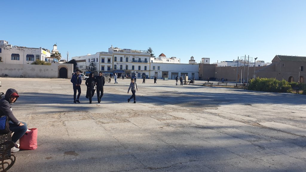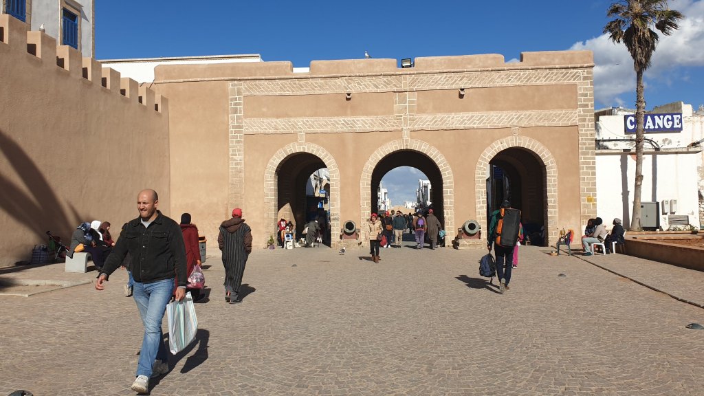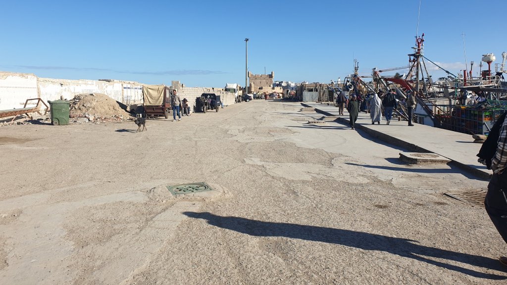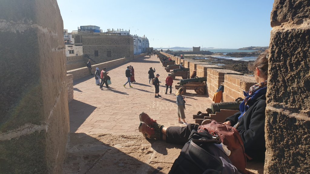 Ça a même bien été. Une jolie journée dans l’ancienne Mogador grâce au soleil et malgré le vent. Nous sommes partis à 10h du matin de notre base du jour à Sidi Kaouki dans un beau minibus-taxi que nous avions commandé : 500DH (45€) pour nous (8 personnes) conduire à Essaouira (27 km) et nous ramener le soir à l’heure de notre choix, soit un peu moins de 6€ par personne l’aller-retour, une fortune !