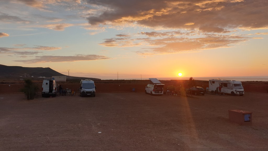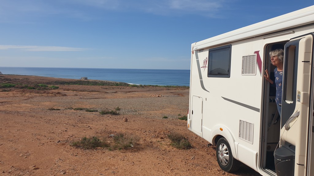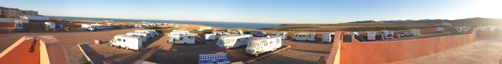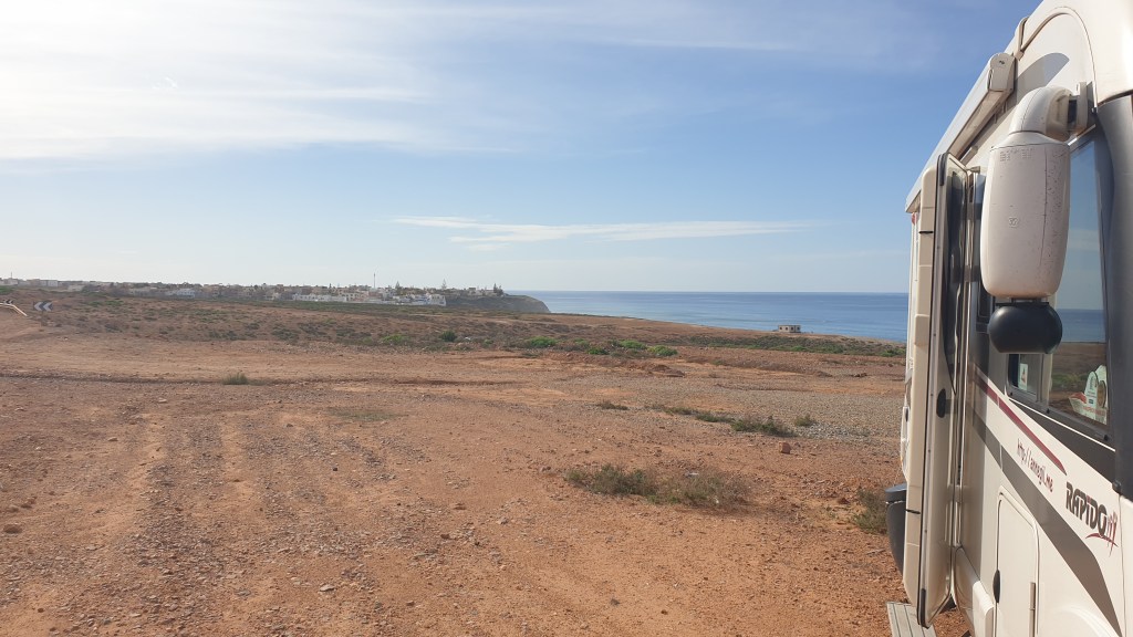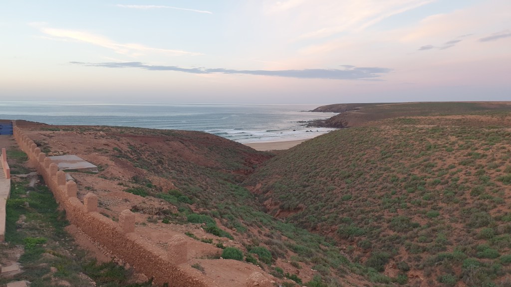 Arrivés sur le coup de midi à Tiznit, nous faisons un petit pèlerinage vers 2020. Pas trop de changements. Nous repartons vers la mer, pause déjeuner en bonne vue, puis arrivée à Mirleft où nous restons 2 nuits. Le première est passée. Nuit de fête, couchés 2h, oreilles en compote, mais c’était un bien joli dîner, bien animé, bien arrosé par Jean qui avait anticipé les rigueurs locales et amené un stock français.